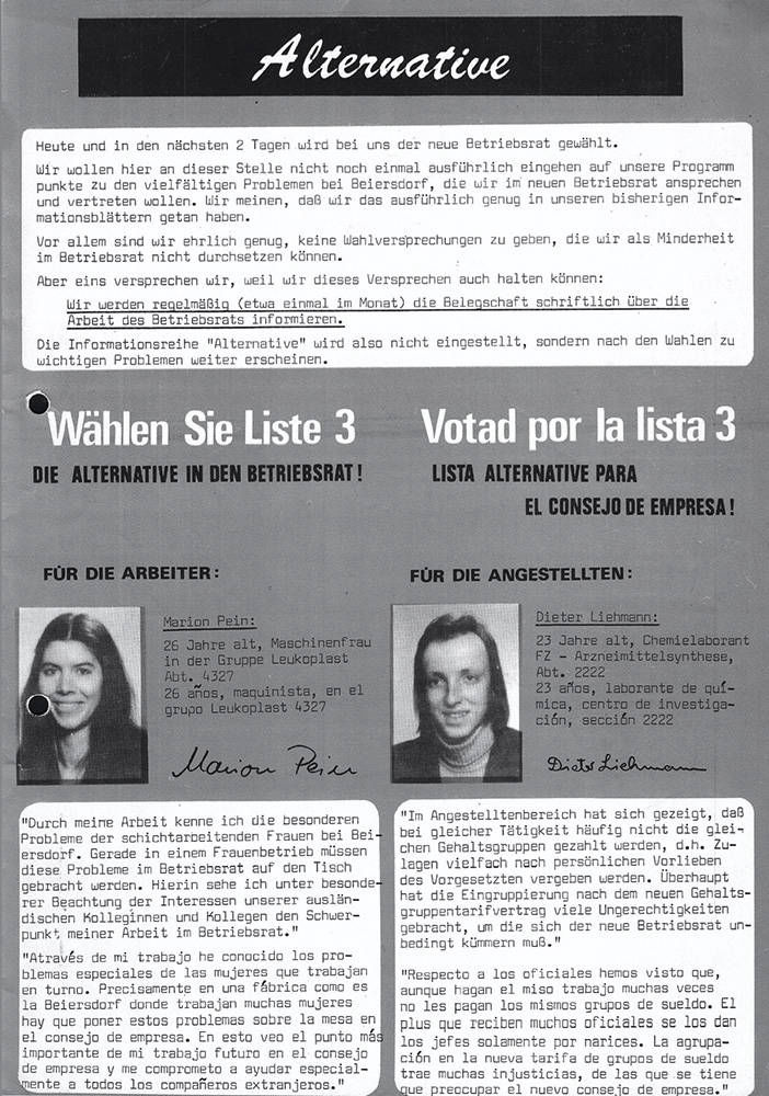 Im April 1975 fand bei Beiersdorf die Betriebsratswahl statt. Marion und ich waren damals die Spitzenkandidatin/Spitzenkandidat im Arbeiter- und Angestelltenbereich auf einer „Alternativen Liste", die in Opposition zur Liste der damaligen IG Chemie/Papier/Keramik antrat. Marion wurde gewählt, ich scheiterte knapp an 2 Stimmen im Angestelltenbereich, kündigte 2 Jahre später, um nach Westberlin zu gehen.